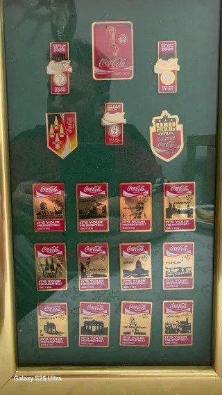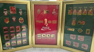 Pins coca cola fútbol en su marcó original. Se puede colgar o se puede poner en una vitrina. Consta de 3 partes.