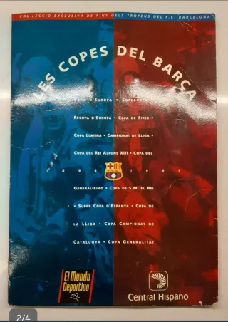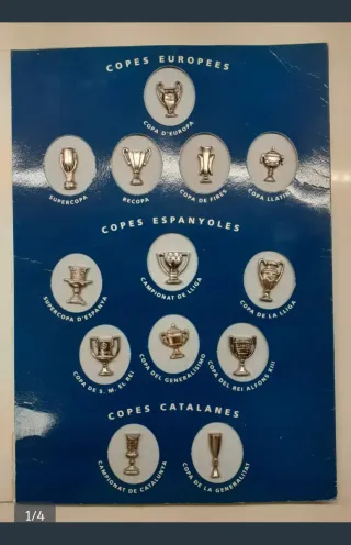 Colección de pins o insignias de las copas ganadas por el Fútbol Club Barcelona. - Copas Europeas: Supercopa, Copa D'Europa, Recopa, Copa de Fires, Copa Llatin. - Copas Españolas: Supercopa D'Espanya, Campionat de Lliga, Copa de La Lliga, Copa Del Generalísimo, Copa Del Rei Alfons XIII, Copa De S. M. El Rei. - Copas Catalanas: Campionat De Catalunya, Copa De La Generalitat. Colección de 1993