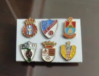 Conjunto de seis pins con escudos de clubes de fútbol.