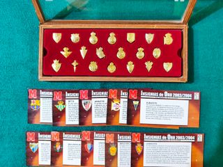 Colección de pines bañados en oro de la temporada 2003/2004 de la Primera División. Incluye cofre expositor - Incluye 20 insignias de diferentes equipos de fútbol. - Presentadas en una caja de madera con tapa de cristal. - Cada insignia representa el escudo de un club de fútbol español. - 10 fichas con la historia del club. Hago envío ordinario o envío Wallapop. Pago por Bizum o Wallapop. Se puede entregar en persona en Madrid Capital, zona Embajadores / Pirámides. Más lotes en mi perfil.