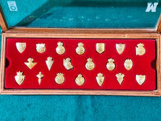 Colección de pines de equipos de fútbol del año 2003 - Diseño metálico dorado. - Presentados en una caja forrada de terciopelo rojo.