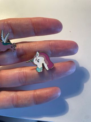 Preciosos pins de unicornios, ideales para coleccionistas o amantes de lo kawaii. Son dos pins con diseños encantadores. - Diseño de unicornio con alas. - Diseño de unicornio con detalles en colores pastel. - Son pequeños y delicados.
