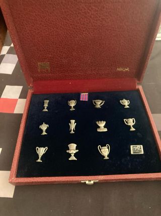 Conjunto de pines conmemorativos de copas del FC Barcelona. - Diseño detallado de trofeos. - Presentados en una caja. - Incluye un pin con un escudo.