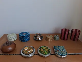 Conjunto de varias cajitas decorativas y dos vasos. - Seis cajitas de diferentes tamaños y diseños, algunas con incrustaciones. - Dos vasos de cristal con rayas verticales en tonos rosas y morados.