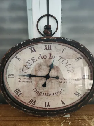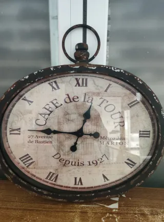 Reloj de pared con un diseño inspirado en los cafés parisinos y un estilo vintage. Presenta un mapa antiguo como fondo y números romanos. - Diseño Café de la Tour. - Inspiración 27 Avenue de Bastien. - Detalle Depuis 1927. - Marco con acabado envejecido.