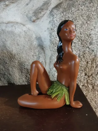 Figura decorativa de una chica hula. Tiene sello en la base - Material: Porcelana. - Altura: 15,5 cm. - Ancho: 12 cm.