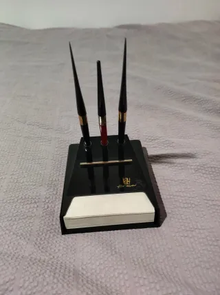 Elegante portabolígrafos de la marca For Ever, con un diseño moderno y funcional. Incluye 3 boligrafos y muchas notas, perfecto para usar o decorar tu despacho - Base de color negro brillante. - Incluye un bloc de notas blanco. - Soporte para tres bolígrafos o plumas.