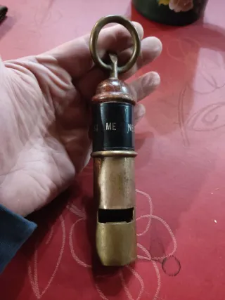 Silbato antiguo de bronce o latón con un diseño clásico. Inscripción si me necesitas Silba - Material: Bronce o latón. - Medidas: 19 cm de largo y 3,5 cm de diámetro.