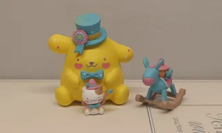 Figura de Sanrio Pompompurin. - Figura de Pompompurin con un gatito. - Figura de burro balancín azul.