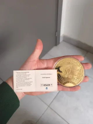 Moneda grande de colección bañada en oro, con un peso de 110 gramos. Representa el diseño de la Libertad de 1933. Con certificado de autenticidad, edición limitada solo 9999 unidades en el mundo. Sin abrir en su cápsula de plástico - Peso: 110g - Material: Baño de oro - Diseño: Libertad 1933 - Diámetro: 70 mm - Calidad: Proof - Reverso: Águila
