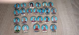Colección de pines del FC Barcelona del Siglo XX. - Incluye jugadores como Couto, Figo, Guardiola, Ronaldo, entre otros. - Pines con retratos de futbolistas. - Diseño circular con nombre del jugador.