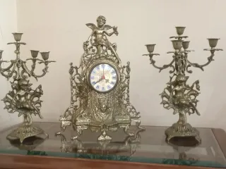 Juego de candelabros de bronce con reloj