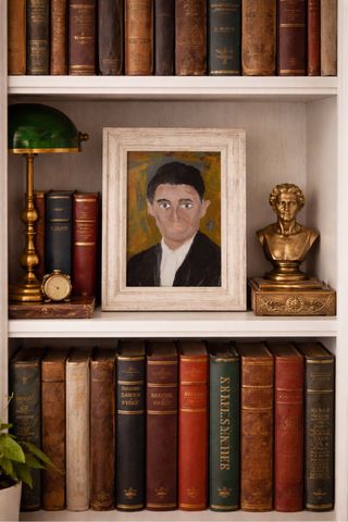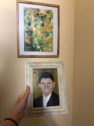 Lámina decorativa con retrato de Franz Kafka. - Marco blanco envejecido. - Estilo de pintura expresionista. Obra propia tamaño 13x18 es una reproducción de mi obra el original no le vendo. En mi perfil dispongo del mismo retrato en oteo tamaño y enmarcado enmarcado en marco de madera estilo vintage blanco, listo para colgar. Tiene un estilo artístico moderno y expresivo que encaja muy bien en decoración de salón, estudio, librería o espacio creativo. Ideal para amantes de la literatura, del arte o de la figura de Kafka. escritores escritoras lectores poetas filosofía grandes escritores