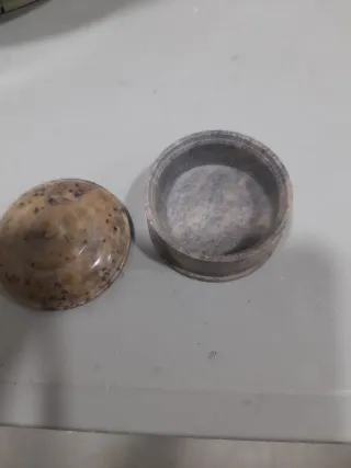 Pequeña caja decorativa de origen indio. - Material: Piedra tallada. - Diseño: Motivos veteados y oscuros. - Tapa con pomo.