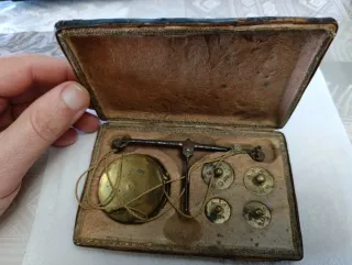 Magnifico juego de balanza y ponderales con contramarca del valor. Servía para pesar monedas de oro y plata. Tiene platillos de latón y ponderales de diferentes medidas onza, duros. El estuche es de madera forrada en piel con ribetes dorados en el exterior y forrado de ante en el interior.Cerrojo de media luna. La caja mide 14,5 centímetros de largo, 7 centímetros de ancho y 2,5 centímetros de grosor. - Incluye la balanza y varias pesas. - Presentado en una caja forrada.