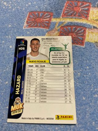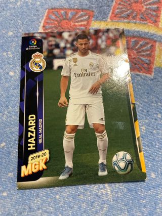 Cromo de Eden Hazard del Real Madrid de la temporada 2019-20. - Coleccionable de LaLiga Santander. - Incluye escudo del Real Madrid. - Diseño con detalles en morado y azul.