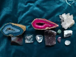 Conjunto variado de minerales y piedras naturales, cada una con sus propias características únicas. Más fotos o cualquier duda escríbeme sin problemas👌 - Geoda de ágata azul. - Geoda de ágata fucsia. - Drusa Amatista -Drusa Cuarzo blanco -Ágata en forma de pirámide -Cuarzo blanco en forma de pirámide (tiene dos bordes desgastados) -Calcita azúl -Piedras pequeñas: Amatista, Aventurina y Cuarzo blanco