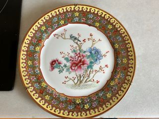 Plato decorativo de porcelana china (1940-1950), conocido como "plato de la familia rosa" o "Guang Cai". Pieza de coleccionista en perfecto estado, tiene una brillante paleta de colores y una decoración detallada. Diseño con un pájaro posado en una rama con flores de peonía, un motivo común en el arte chino que simboliza la prosperidad y la buena fortuna. El borde del plato está decorado con un patrón floral intrincado y un borde dorado. Pieza decorativa única, con un soporte de exhibición y para colgar en la pared.