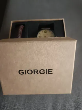 Conjunto de reloj y pulsera con un diseño elegante. - Reloj con esfera clara y números grandes. - Pulsera de imitación cuero trenzado en color marrón.