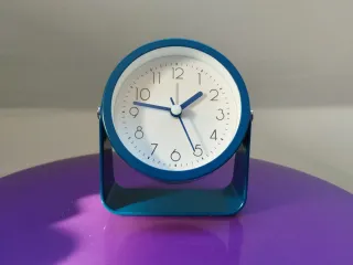 Reloj despertador con un diseño moderno y un pie integrado para colocarlo fácilmente. - Color azulón. - Nuevo. - 8,3x10x3,2cm. - 1 pila AA (no incluida).