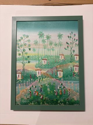 Espectacular pintura original del artista haitiano Gerard Peliote. Una pieza vibrante y llena de vida que representa una escena costumbrista de recolección en una aldea de Haití. En perfecto estado. Enmarcado con un marco de madera en tono verde que resalta los colores de la selva y la vegetación de la obra. Medidas: 34x44cm
