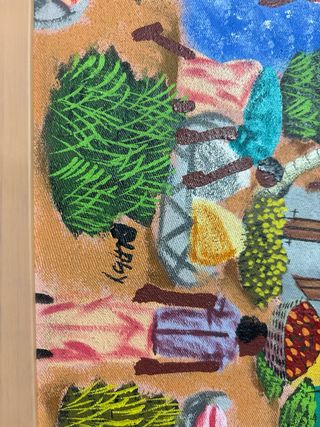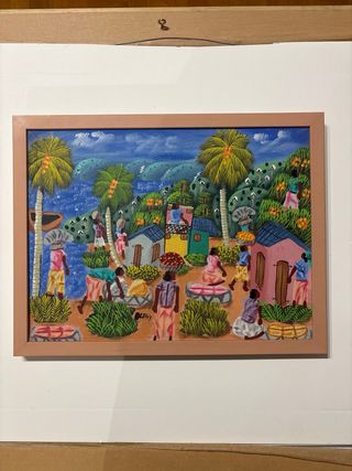Preciosa pintura original sobre lienzo de estilo Naíf Haitiano, firmada por el artista B. Lamy. Una explosión de color y vida que captura la esencia del Caribe. Temática: Escena costumbrista de una aldea tropical con personajes, vegetación exuberante y vista al mar. Técnica: Óleo sobre lienzo. Detalles: Obra muy detallada con el estilo característico de perspectiva plana y colores vibrantes propios de la escuela de Haití. Estado: Muy buen estado de conservación. Enmarcado con un marco de madera sencillo que complementa los tonos cálidos de la obra. Medidas: 34x44cm