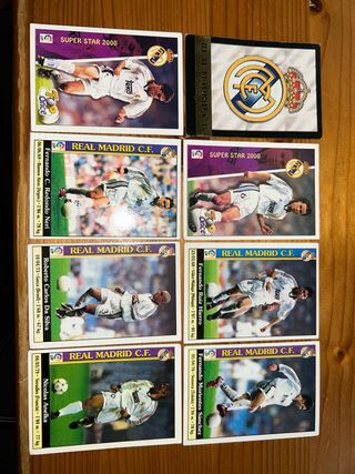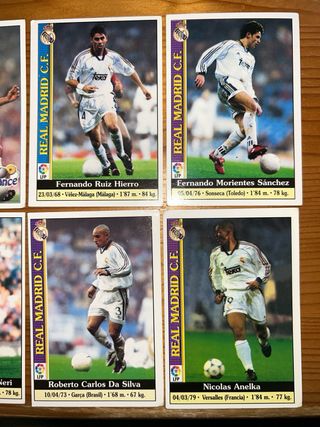 Lote de 8 cromos de la temporada 99/00 del Real Madrid C.F. Incluye cromos de jugadores como Eaul Gonzalez, Fernando Redondo, Roberto Carlos, Nicolas Anelka, Fernando Hierro y Fernando Morientes. Raul y Redondo de la serie Super Star 2000 y Once. Cromos de jugadores en buen estado, cromo del escudo en mal estado.