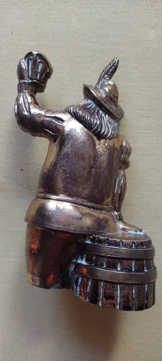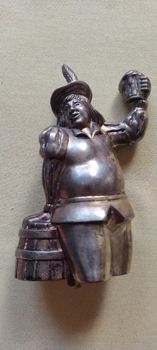 Figura decorativa de Gambrinus, personaje asociado a la cerveza Cruzcampo. Representa a un personaje con sombrero y jarra de cerveza en mano, apoyado sobre un barril. La Cruz del Campo - Material: Metal plateado. - Diseño detallado. 15 cm de alto 2,6 kg.