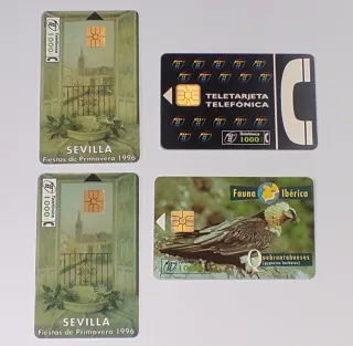 Conjunto de cuatro tarjetas telefónicas de Telefónica. - Dos tarjetas con diseño de Sevilla, Fiestas de Primavera 1996. - Una tarjeta Teletarjeta Telefónica con diseño negro. - Una tarjeta Fauna Ibérica con imagen de quebrantahuesos.