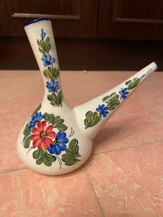 Porrón de cerámica con un diseño tradicional en azul y blanco. Ideal para coleccionistas o como pieza decorativa. - Diseño floral azul. - Asa y dos picos.