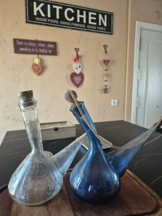 Conjunto de dos porrones antiguos de vidrio, uno transparente y otro azul. Son piezas decorativas con un diseño tradicional. - Porrón de vidrio transparente con tapón de corcho. - Porrón de vidrio azul con cadena dorada.