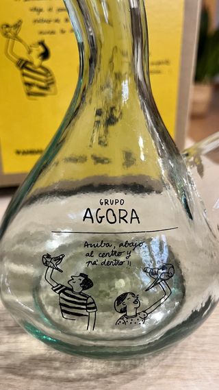 Porrón de vidrio de cerveza ambar de la marca Grupo Ágora, con un diseño único y divertido. - Material: Vidrio. - Diseño: Dibujos originales y texto. - Cierre: Corcho.