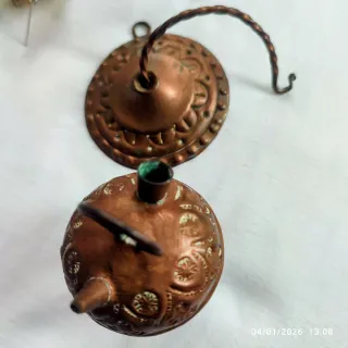 Es un porrón o botijo para colgar con el soporte decorativo de cobre con un diseño intrincado y detalles grabados. Incluye un gancho para colgar. - Material: Cobre - Diseño grabado - Incluye gancho para colgar
