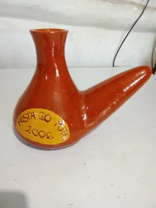 Porrón de cerámica con un diseño tradicional y un toque festivo. Ideal como pieza decorativa o para eventos. Alto 18 cm largo 23 cm - Inscripción Festa do Pote 2006 en la parte frontal. - Acabado brillante en tonos anaranjados y amarillos.