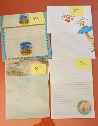 Cartas con dibujos y un delicado perfume, evocando la nostalgia de los años 90. Ideales para coleccionistas o para dar un toque especial a tu correspondencia con diseños vintage y de época. - Las cartas sin sobre tienen un precio de 1,50€ cada una. - Las cartas con sobre tienen un precio de 2€ cada una. - Las portadas de color tienen un precio de 3€ cada una. - Los sobres sueltos tienen un precio de 0,50€ cada uno. - El lote completo son 143€ (6 portadas (3+2 portadas niña rosa+1 mujer lazo cabeza), 5 sobres sueltos (sobre rosa de oso con ramo es suelto), 26 cartas con sobre y 47 cartas sin sobre).