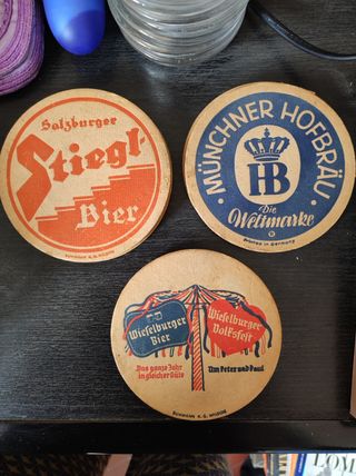 10 posa vasos de cerveza, Made in Germany, hecho en Alemania. Souvenir de hace 40-50 años, ideal para coleccionista o amantes de cerveza. Tienen años pero estan en buen estado de conservación, solo que el cartón se ha vuelto amarillento. 5€ todos Reposagots, reposa got, cervesa. Fet a Alemanya.
