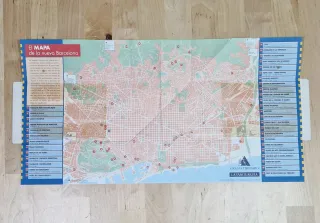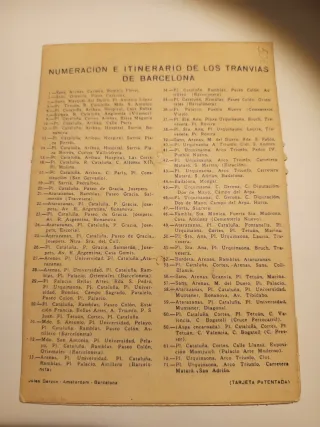 Plano de Barcelona, datado en los años 30 con 131 monumentos y lugares de interés. En un lado hay dos páginas con un índice numérico con los lugares de interés, desde los más famosos que todavía existen, como la Catedral, el Ayuntamiento o el Liceu, hasta teatros, cines u hoteles, algunos ya desaparecidos (Teatro Español, Cine Pathé, Hotel Bristol, etc.). En el otro lado está el mapa desplegable con los lugares y las lineas de ferrocarriles, tranvia y autobuses, paradas, etc En todo colección se vende por 50€ (última foto) Si se compra el libro “Barcelona, la perla de la Mediterrània”, los dejo por 24€ los dos.