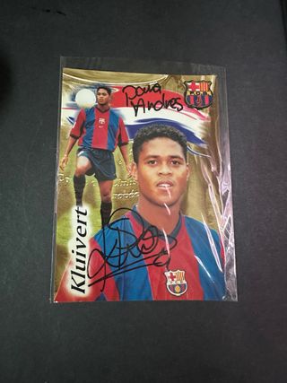 Postal del FC Barcelona con autógrafo de Patrick Kluivert. - Autógrafo dedicado. - Imagen de Kluivert en acción. - Escudo del FC Barcelona.