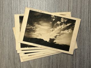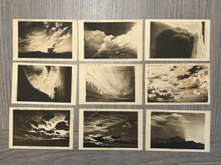 Colección de 12 postales originales con fotografías de nubes realizadas en el Observatorio del Ebro. Imágenes de gran valor estético y científico que capturan formaciones nubosas espectaculares y paisajes celestes únicos, acompañadas de textos explicativos impresos en los márgenes. Postales editadas por Huecograbado Mumbrú (Barcelona). Tal y como se ven. Alguna tiene pérdidas por pez de plata, visible en fotos