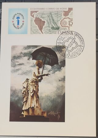 Hoja conmemorativa del evento ESPAMER 77 celebrado en Barcelona. - Ilustración central de la Estatua de la Libertad con paraguas firmada por "Alart" - 2 Sellos postales conmemorativos del II Centenario Correo de Indias. - Matasellos oficiales del evento - Fecha: 7-13 octubre 1977. - Lugar: Barcelona. - Evento: Exposición Filatélica de América y Europa.