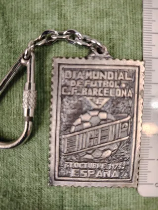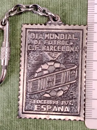 Llavero conmemorativo del I Día Mundial del Fútbol. Partido realizado en el camp nou (ver dos últimas fotos) - Diseño inspirado en un sello postal. - Incluye el escudo del F.C. Barcelona. - Fecha: 31 de octubre de 1973. - Grabado España.