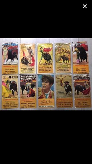 Lote de 10 postales de carteles de corridas de toros, sin circular. Incluyen imágenes de toreros y toros. Editadas en 1964 por Postalcolor y Carretero - Carteles de El Cordobés. - Diversas plazas: Sevilla, Valencia, Córdoba, Barcelona. - Nombres de toreros como Antonio Ordóñez, Curro Romero, Diego Puerta, Paco Camino, Antonio Bienvenida, Victoriano Valencia, José M. Montilla, El Viti. Algunas con signos de fatiga, Ver fotos