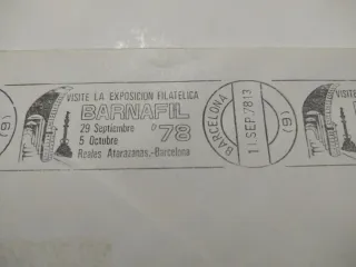 Sobre postal con matasellos de la exposición filatélica Barnafil. - Fecha del matasellos: 11 de septiembre de 1978. - Lugar: Reales Atarazanas, Barcelona. - Dirección del remitente: J. Campderrós, Publicista Filatélico, Lealtad, N.º 6, pral. 2.ª, Barcelona-1, España.