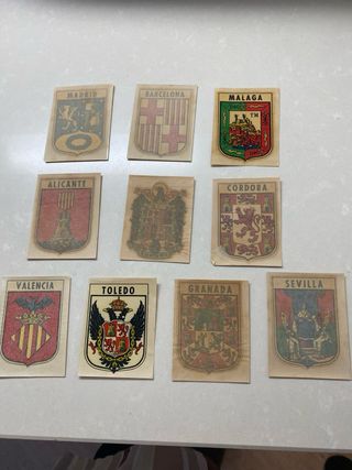 Conjunto de 10 calcomanías antiguas con escudos de diferentes ciudades españolas. - Madrid - Barcelona - Málaga - Alicante - Córdoba - Valencia - Toledo - Granada - Sevilla - Escudo central sin nombre visible