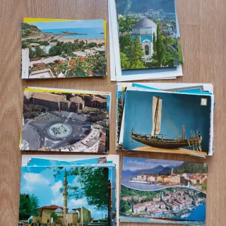 300 postales, casi todas de España pero también hay de Portugal, Francia e Italia de los años 60 a 80 bien conservadas. La mayoría son nuevas, el 95%, solo hay 20 unidades con sello y usadas. Hay algunas de Roma, Biarritz, Mónaco, Lisboa... Prácticamente todas de España y sus pueblos, tradiciones, lugares preciosos, algunos han desaparecido o han cambiado. Irrepetibles, únicas y raras de encontrar. Lógicamente es imposible subir todas a wallapop, sólo permite 10 fotos.