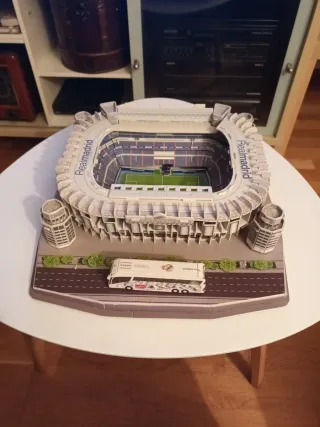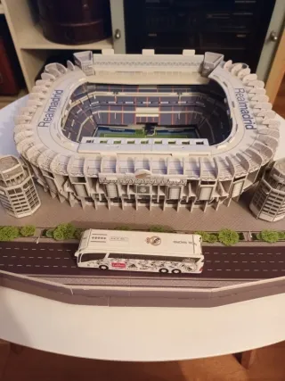 Réplica detallada del estadio Santiago Bernabéu, hogar del Real Madrid.Comprada en tienda oficial.Se regala postal antigua del estadio. - Incluye autobús del equipo. - Base con césped y gradas. - Escala representativa.