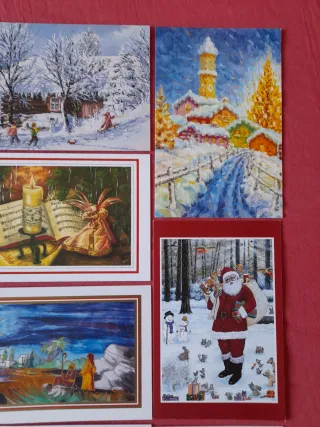 Conjunto de once postales con motivos navideños, de pintores con boca y pie, sin escribir. Se entregan en San Fermín Orcasur, Madrid. También se envían.