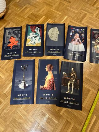 Conjunto de pósters de la colección del Ayuntamiento de Madrid. - Representaciones artísticas y monumentales. - Diseño distintivo con el nombre de Madrid y siluetas de edificios.