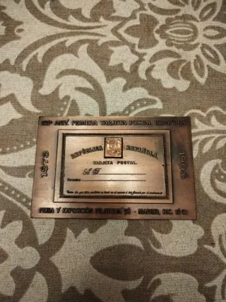 Placa conmemorativa del 125º aniversario de la primera tarjeta postal española. Anverso: reproducción de la primera tarjeta postal, inscripciones en los cuatro laterales de la placa "125 aniv. primera tarjeta postal española-Feria y exposición Filatelia '98. Madrid, dic. 18-21-1873-1998. Reverso en blanco. Bronce. 130 gramos. 10x6,5 cm.