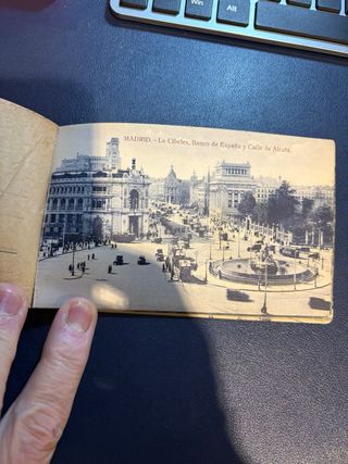 Conjunto de postales antiguas de Madrid, presentadas en una tira plegable. Ediciones F. Molina. - Imágenes de lugares emblemáticos de Madrid. - Texto en español en cada postal. - Formato de tira desplegable.